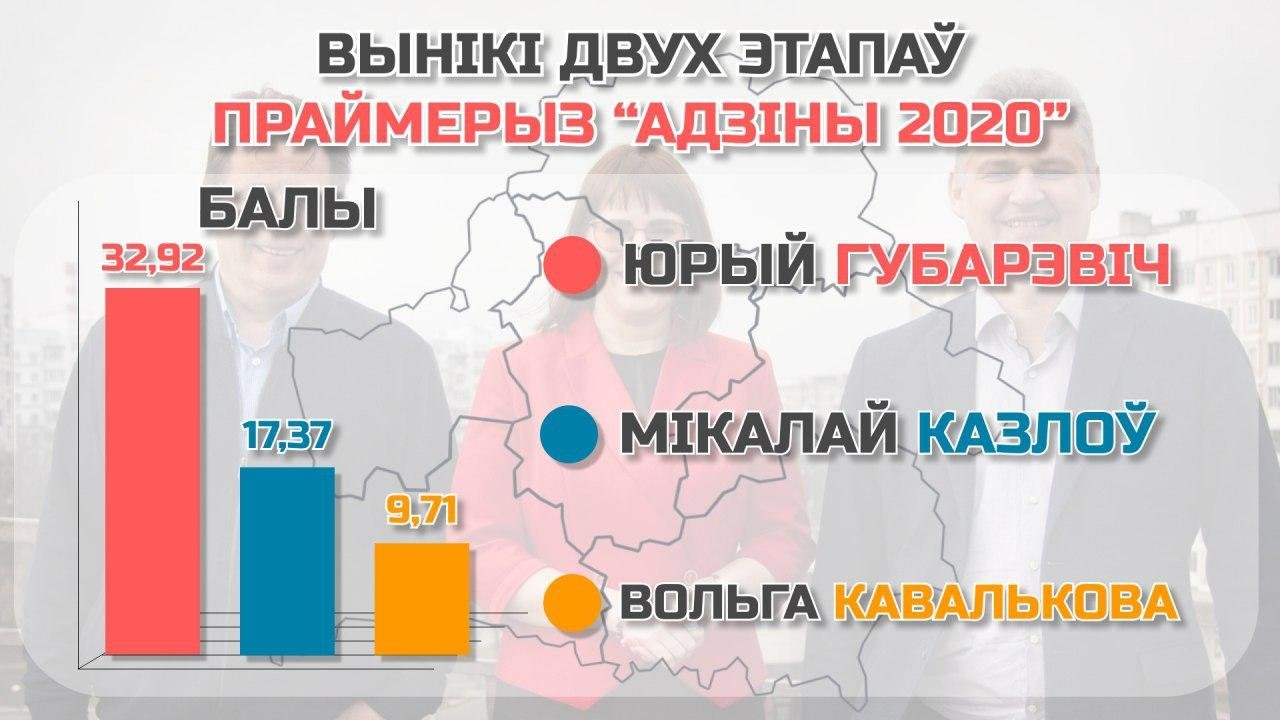По результатам первого этапа праймериз голоса распределились следующим образом: Юрий Губаревич — 73,59% (248 голосов), Николай Козлов — 18,1% (61 голос), Ольга Ковалькова — 8,31% (28 голосов). Окончательные результаты первого этапа будут подведены после 15 мая, когда офлайн-голосование должно было завершиться в соответствии с Соглашением о порядке проведения праймериз.